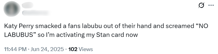Earlier this month, at another concert in Australia, Perry was also seen widening her eyes after seeing a fan holding a Labubu in the crowd.
