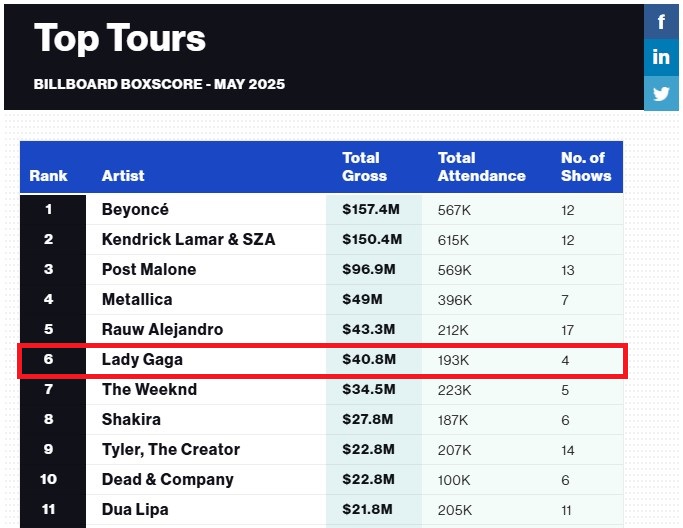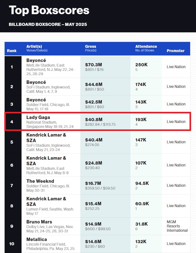 Billboard Boxscore, which compiles monthly lists of top-grossing concerts, put Lady Gaga at No. 4 in its rankings for May, out of 30 separate concert appearances.
