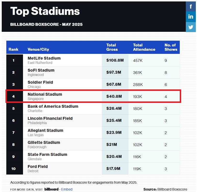 The concerts were also a boon for our National Stadium, which made it to No. 4 on Billboard’s list of 10 Top Stadiums in May.