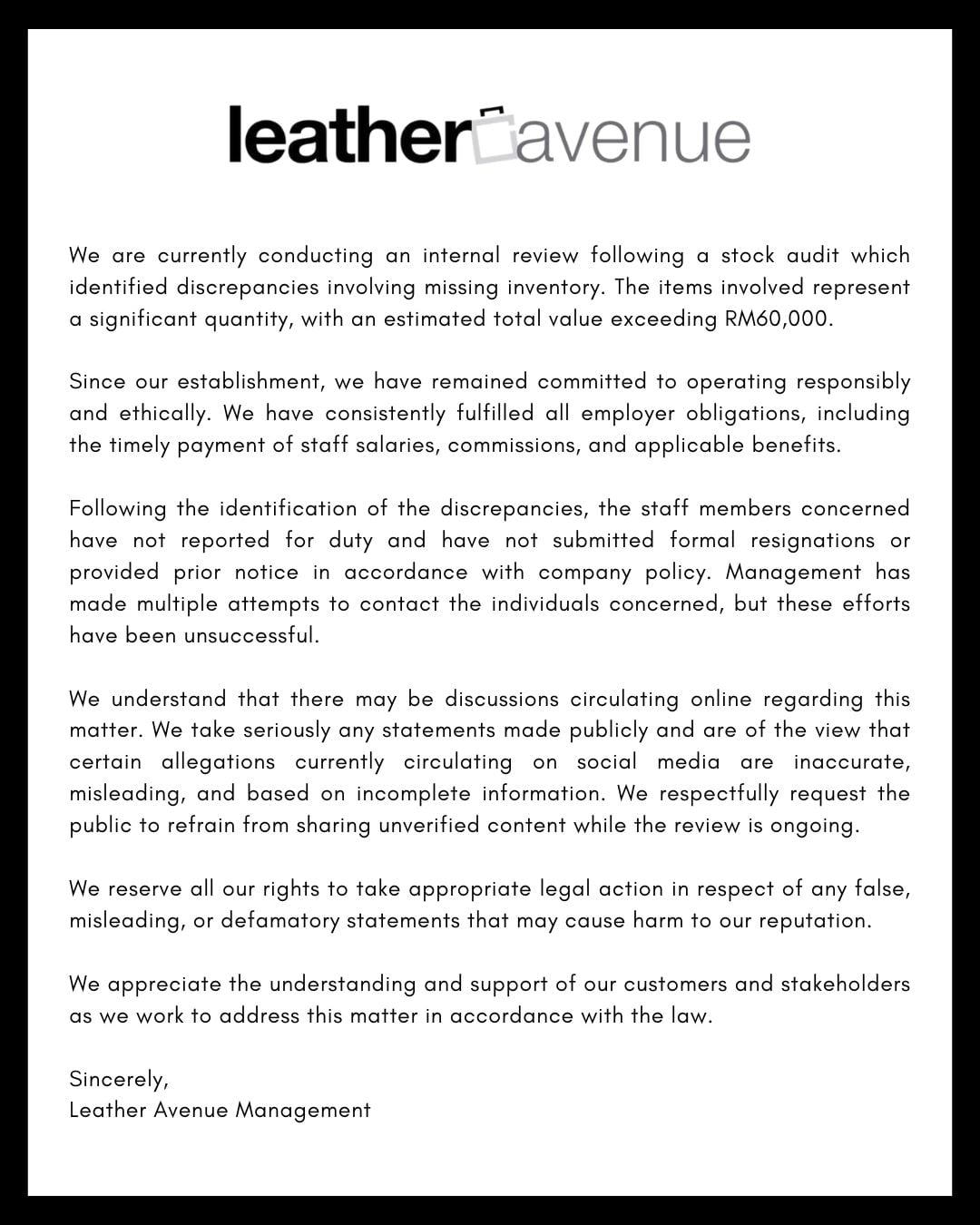 On Monday (2 Feb), Leather Avenue issued a statement on social media, stating that it is conducting an internal review following a stock audit which identified missing inventory valued at over RM60,000 (about S$19,000).