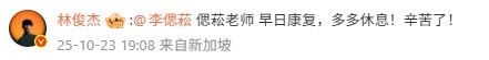 Lin also sent words of encouragement, saying, “Teacher Shih Song, get well soon and get plenty of rest! You’ve worked so hard.”