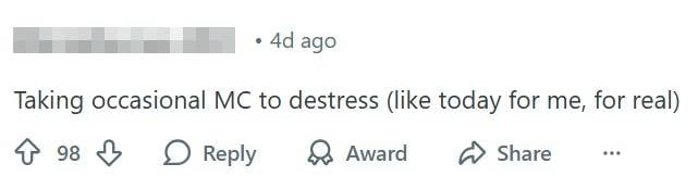 Another Redditor shared that they would take the “occasional MC” to destress from work.