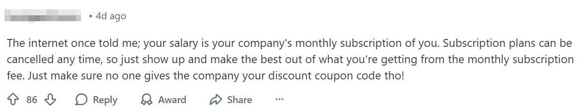 Another likened their job to a “monthly subscription”, suggesting it helps to view work in more transactional terms.