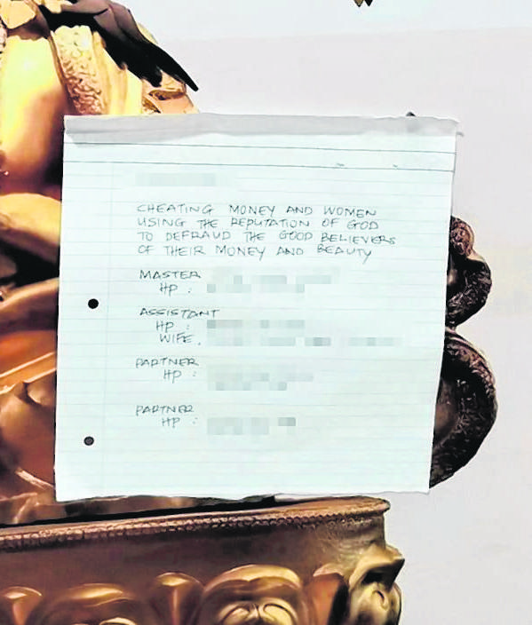 A separate slip of paper attached to the poster accused the man of “cheating money and women using the reputation of God to defraud the good believers of their money and beauty”.