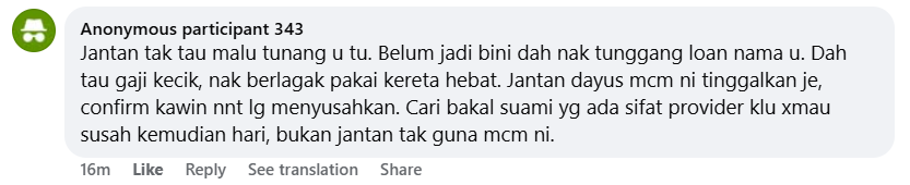 Translation: That man has no shame, your fiancé. You’re not even his wife yet and he already wants to ride on a loan under your name. Knowing his salary is low, he still wants to show off by driving an impressive car. A weak, useless man like this should just be left behind. If you marry him, it’s guaranteed he’ll only cause you more trouble. Find a future husband who has the qualities of a provider if you don’t want hardship later in life, not a useless man like this.
