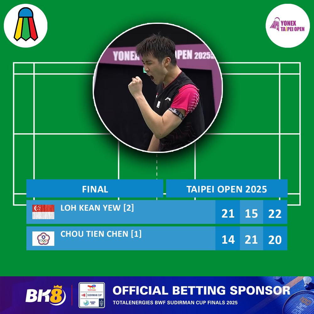 In the tense third game, Loh took the lead before Chou pulled level, with Loh coming back to edge the third game 20-22 and win the match.