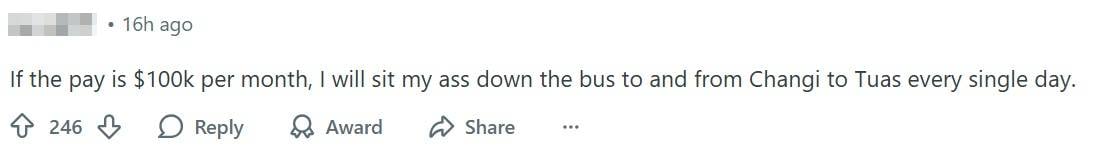 Another joked that they would willingly travel across Singapore if they were paid S$100,000 a month.