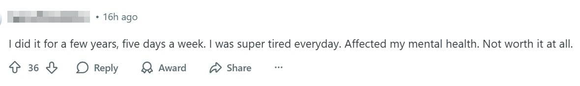 One Redditor shared that after enduring a long commute for several years, the exhaustion took a toll on their mental health.