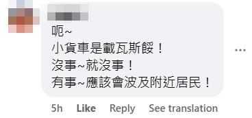 Translation: The small truck is carrying gas cylinders! If nothing happens, then fine! But if something does happen, it’ll likely affect nearby residents!