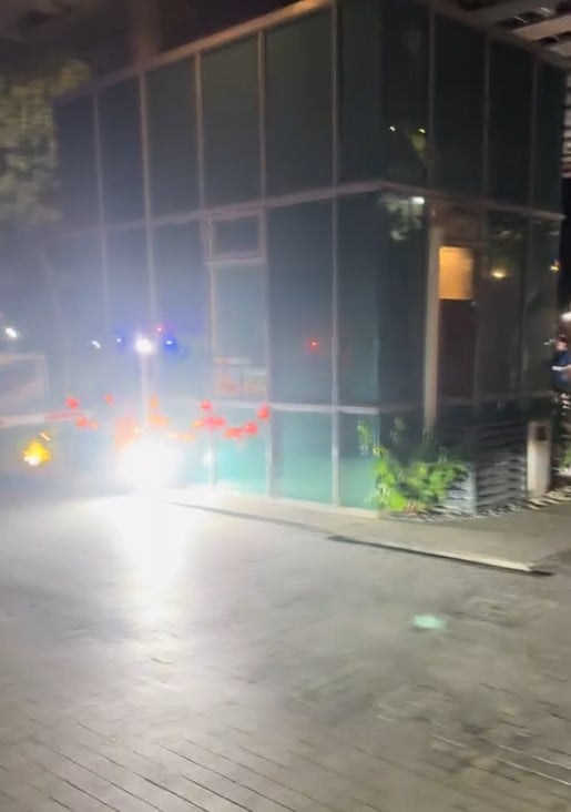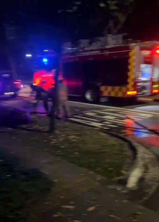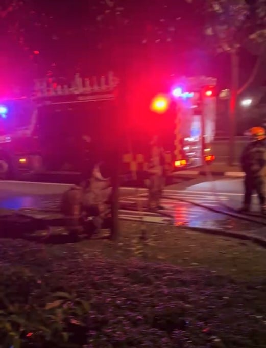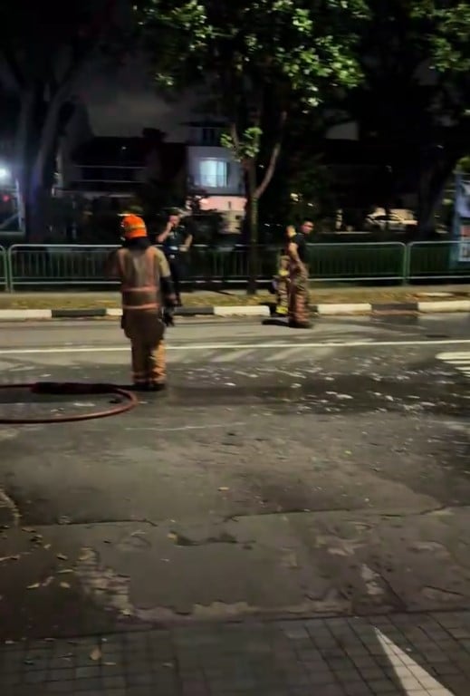 Several Singapore Civil Defence Force (SCDF) officers and at least one police officer were at the scene, with the road wet and a hose suggesting that a fire had just been put out.