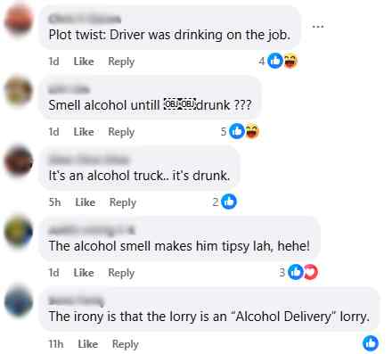 Netizens were quick to note the irony of the lorry being an alcohol delivery vehicle, with many joking that the driver was drunk.