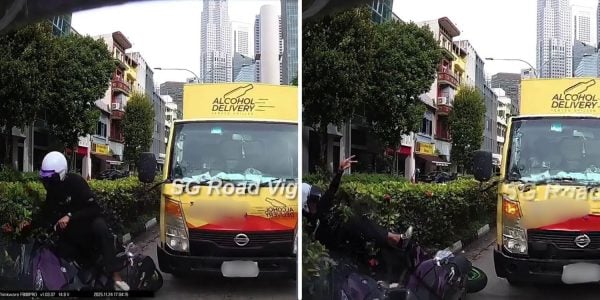 Lorry rear-ends motorcyclist at traffic light along North Canal Road, rider falls into bushes