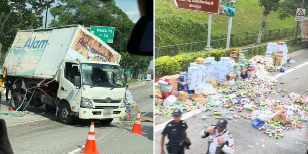 Lorry overturns on SLE near Mandai, leaves drinks strewn along expressway