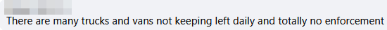 One commenter claimed that large vehicles frequently fail to keep left and expressed frustration over the lack of enforcement.
