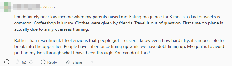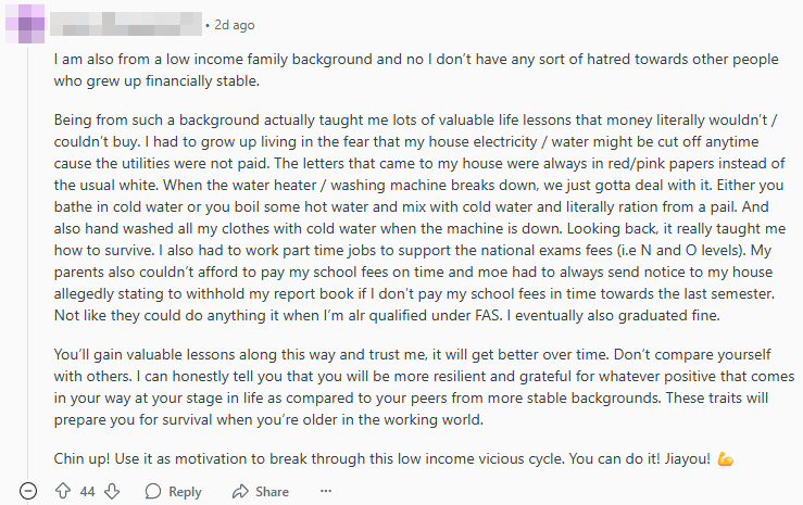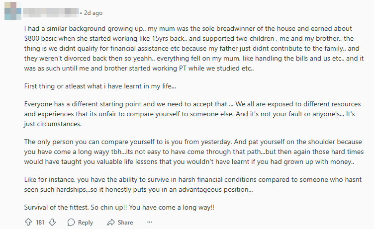 One commenter said they came from a similar background, but refused to feel resentment towards others who were more financially privileged.