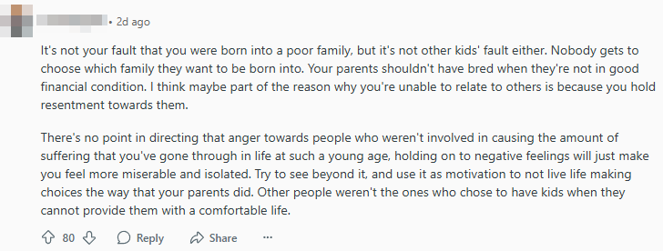 “It’s not your fault that you were born into a poor family, but it’s not other kids’ fault either,” another wrote, adding that nobody gets to choose which family they are born into.
