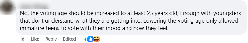 Meanwhile, those who disagreed held the opinion that “youngsters” would not understand the consequences of their votes, let alone know who is in Government.