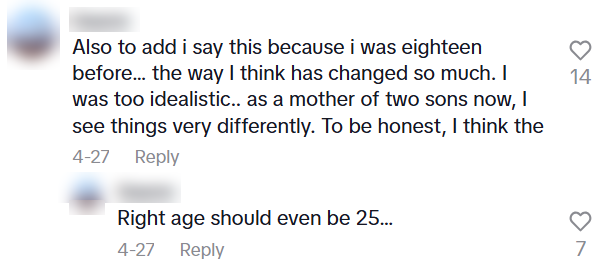 For another netizen, her experience of becoming a mother made her realise she was too idealistic at 18, noting that the way she thinks has changed drastically since then.