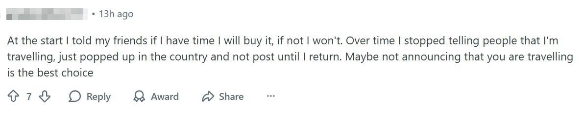 Another netizen shared their own solution, saying they stopped telling people they were travelling to avoid such requests altogether.