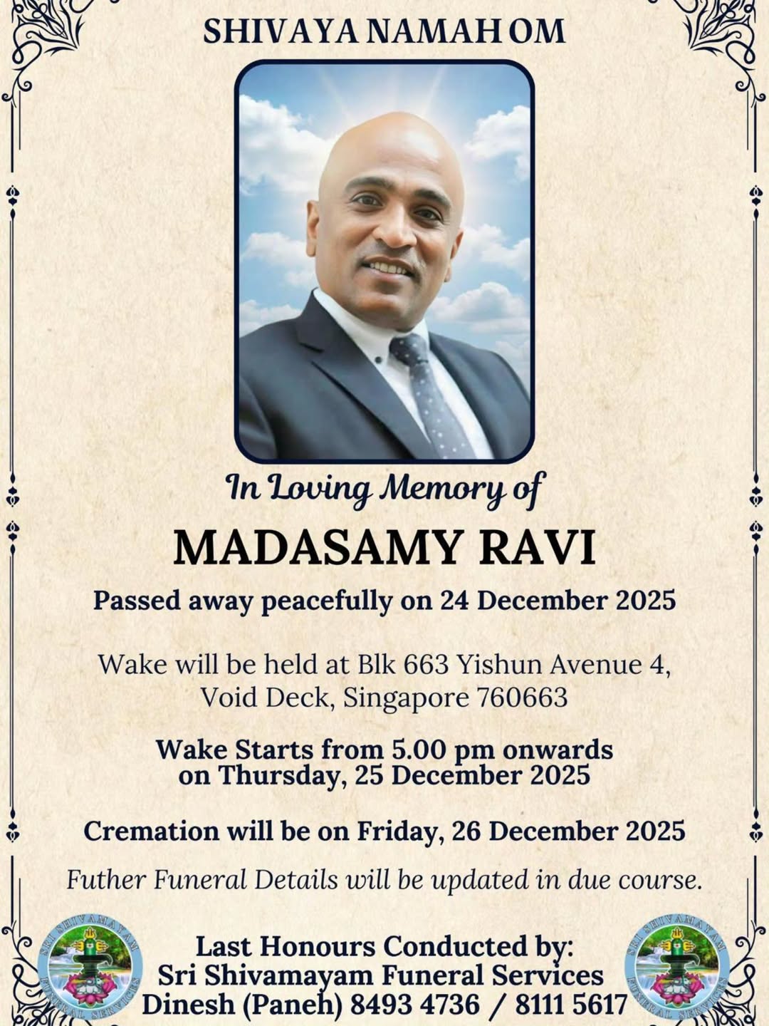 According to an obituary circulating on social media, Mr Ravi’s wake will be held in the void deck of Block 663 Yishun Avenue 4 from 5pm on Christmas Day (25 Dec).