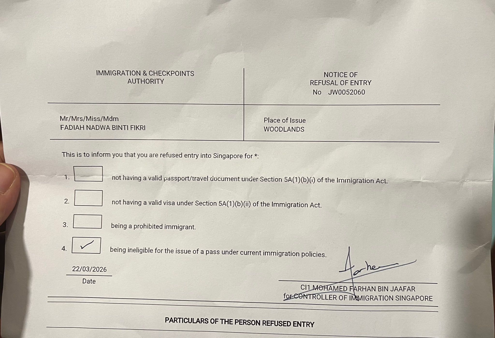 Sharing a photo of a Notice of Refusal of Entry from the Immigration & Checkpoints Authority (ICA), Ms Fadiah said she had been banned from entering Singapore.