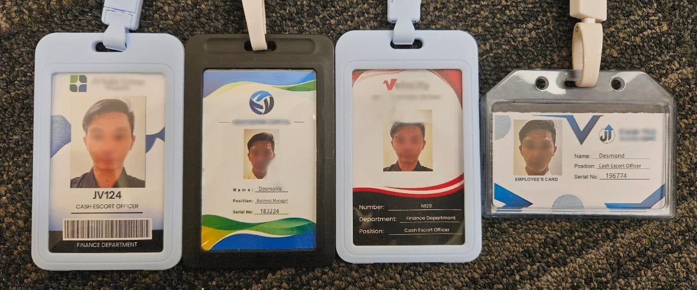 Fake staff passes were found on him and seized as evidence. He is believed to have used them to identify himself before collecting cash and valuables from scam victims.