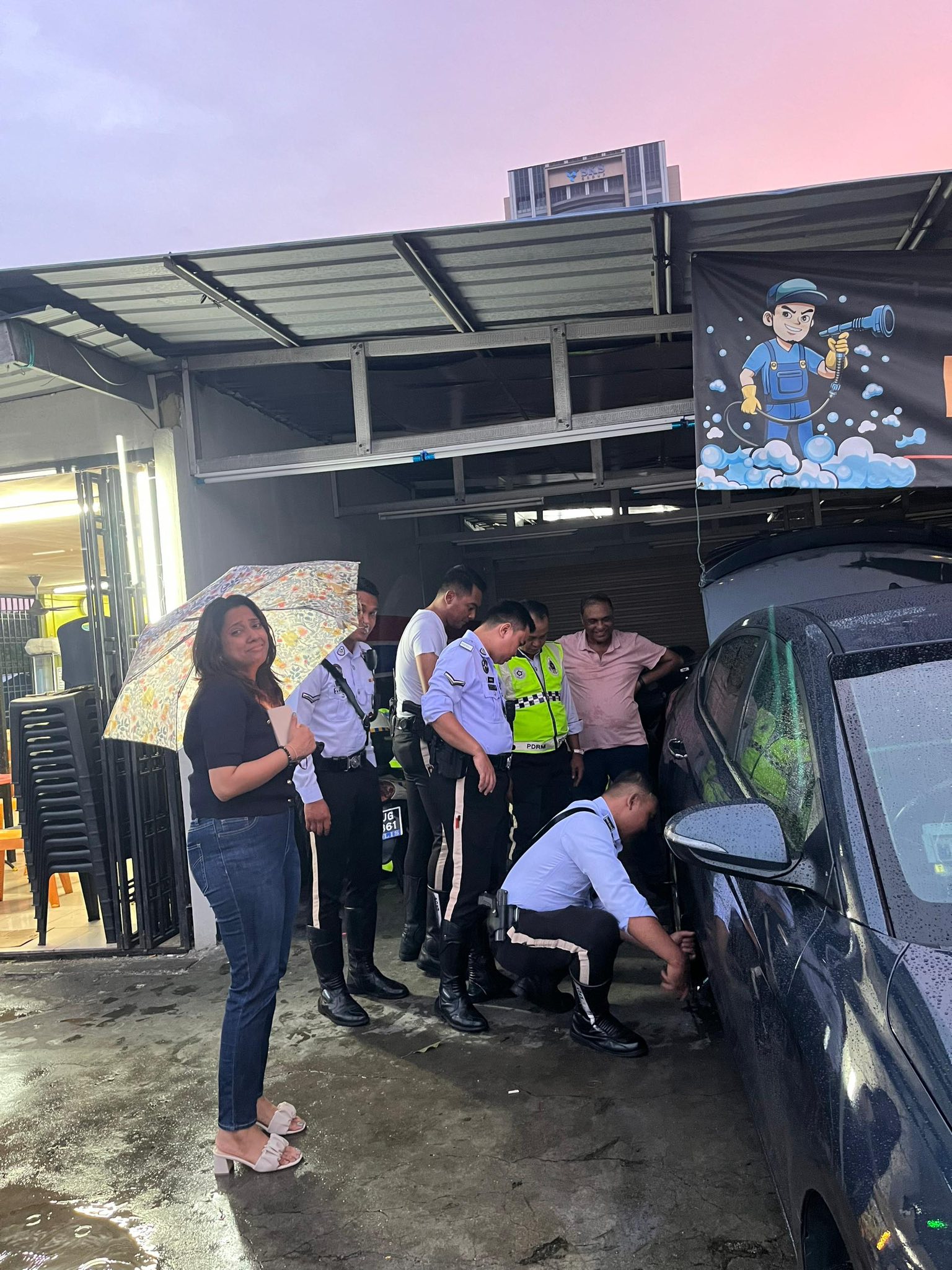 Malaysian police officers seen changing flat tyre