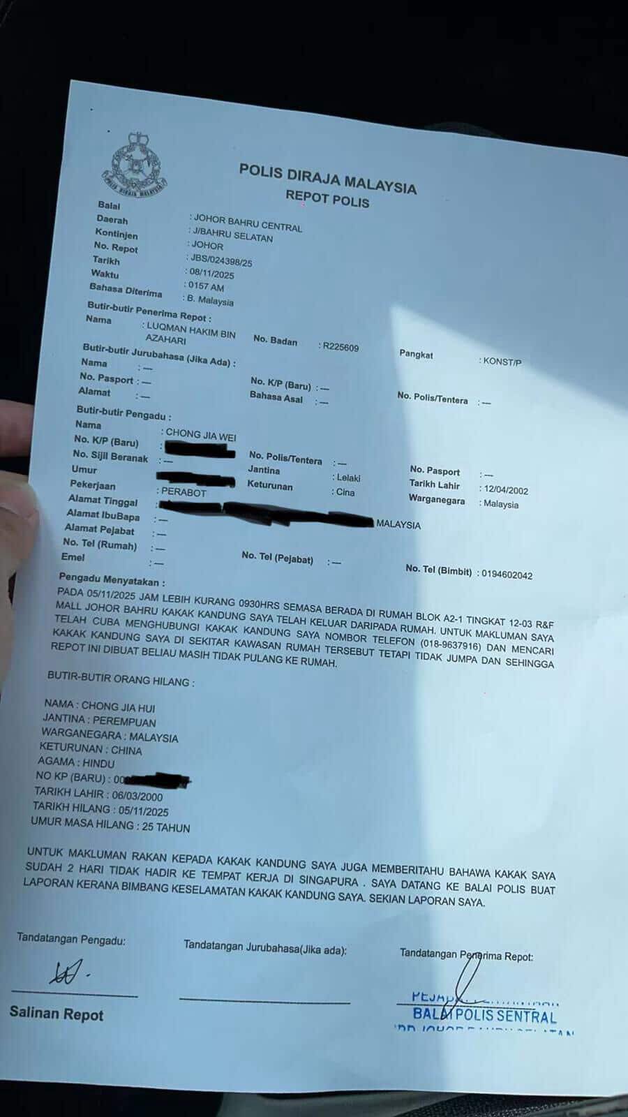 JB police confirmed that her younger brother had made a police report, and they were investigating.