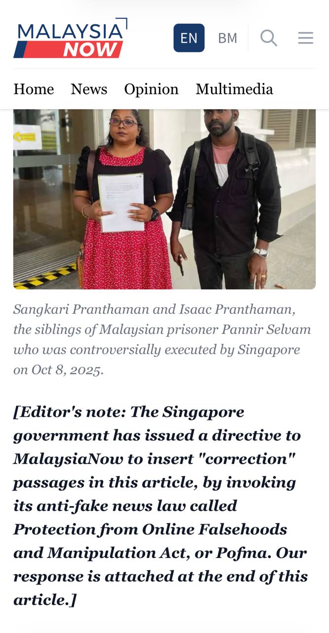Singapore blocks access to MalaysiaNow after news outlet rejects POFMA order over drug courier article