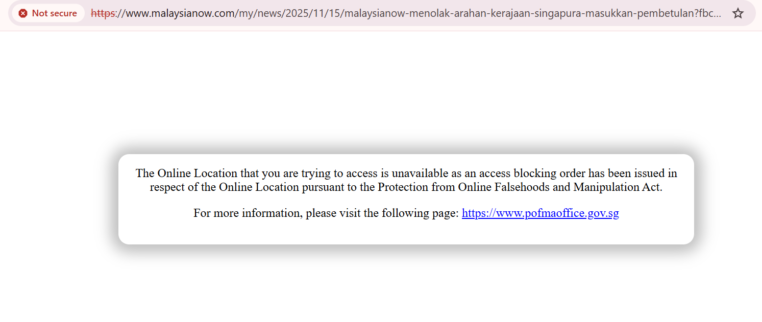 After MalaysiaNow declined to comply, the Minister for Digital Development and Information directed the Infocomm Media Development Authority (IMDA) to issue access-blocking orders.