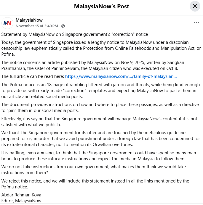 In a Facebook post on Saturday (15 Nov), editor Abdar Rahman Koya said the outlet does not “take instructions” from the Singapore Government.