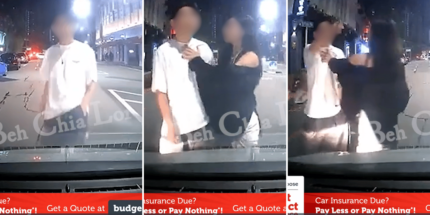 As the drunk man and the driver began shouting and cursing at each other, the woman lightly nudged her friend to the side of the road.