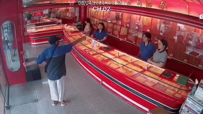 He can be seen gesturing aggressively at staff, apparently demanding the gold displayed at the back of the store.
