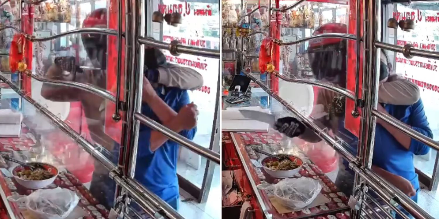 Security footage showed the robber — wearing a face mask, a crash helmet, jeans, and a long-sleeved jacket — entering the shop through the glass door and grabbing 57-year-old Sureenut Buasri (name transliterated) as she was leaving after pawning a gold ring.