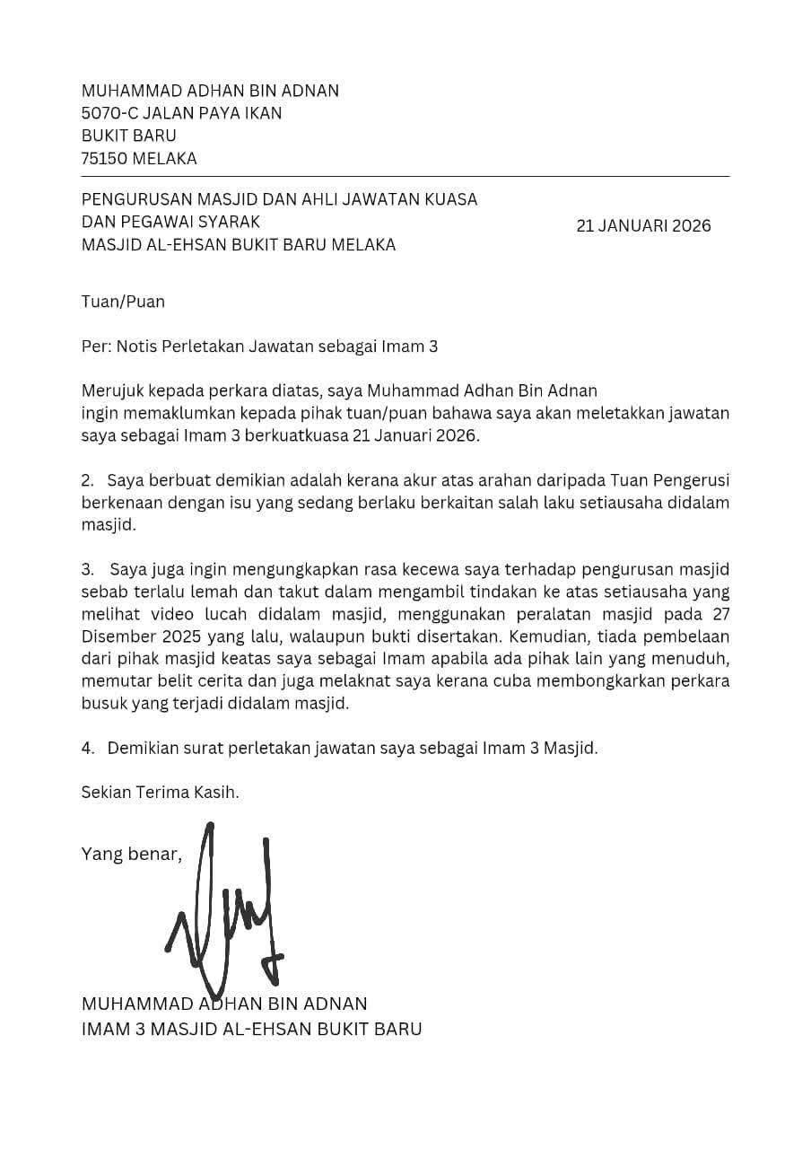 However, it was Imam Muhammad Adhan who first submitted his resignation on 21 Jan, citing instructions from mosque management regarding the ongoing issue involving the secretary’s misconduct.