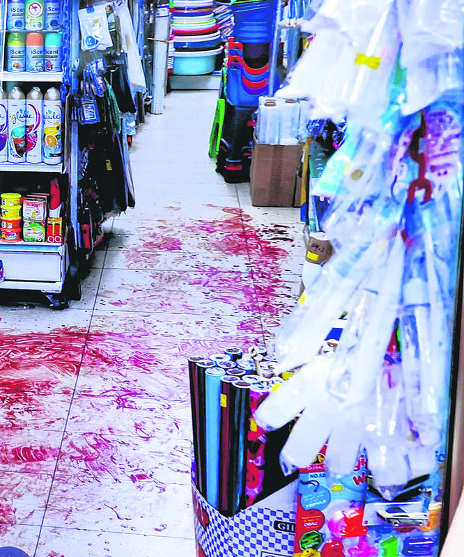 He was holding on to his bleeding left wrist, with a blood trail of at least 3m long on the floor in front of the counter.