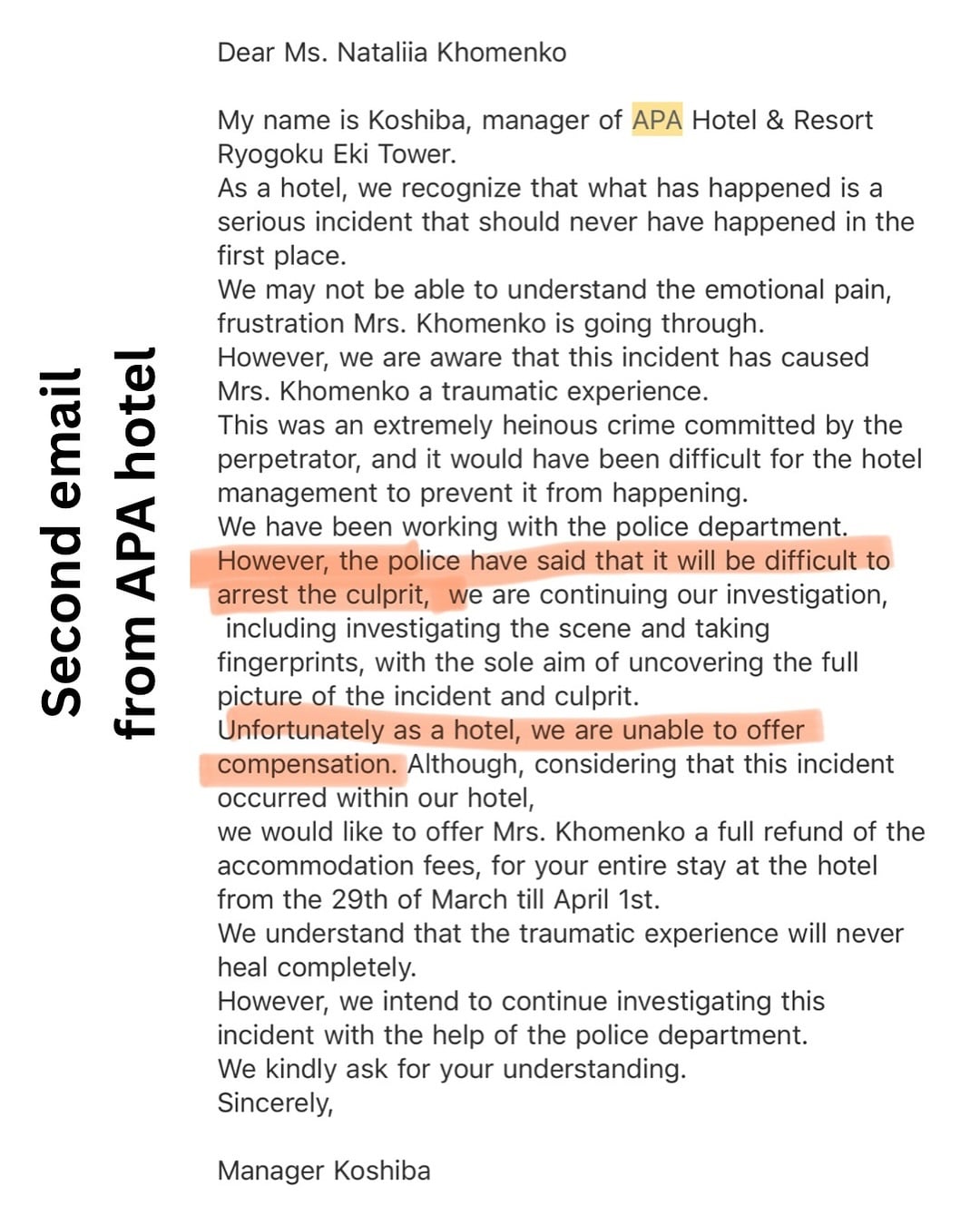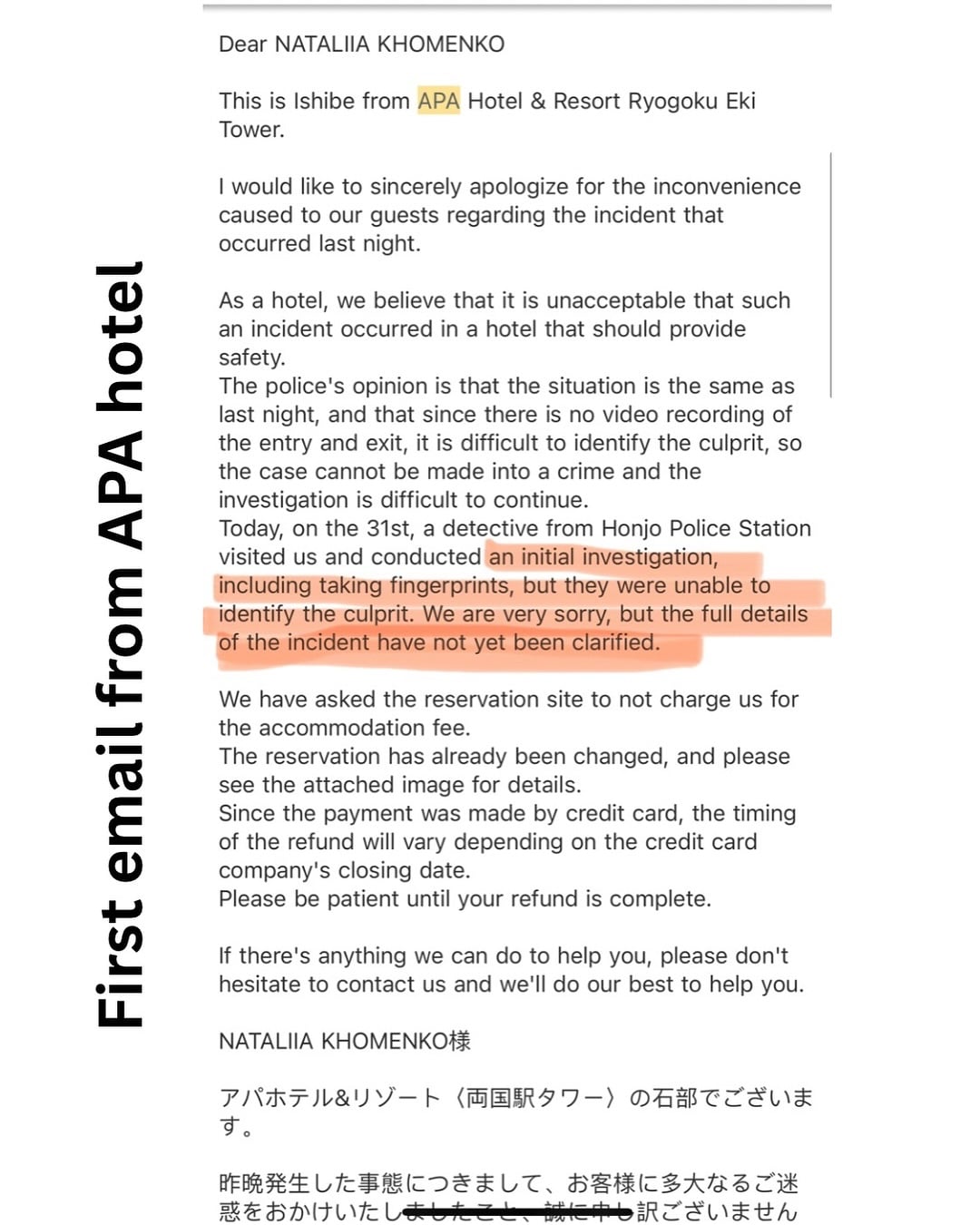 Ms Khomenko demanded a full refund from the manager of APA Hotel’s Ryogoku branch, but they allegedly did not respond to her or send her an update regarding the police report.