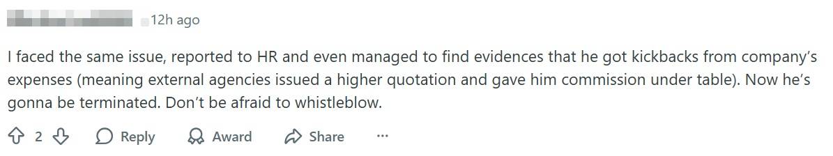 One Redditor shared a similar experience, mentioning that they had reported a similar situation to HR, resulting in the termination of the offending manager.