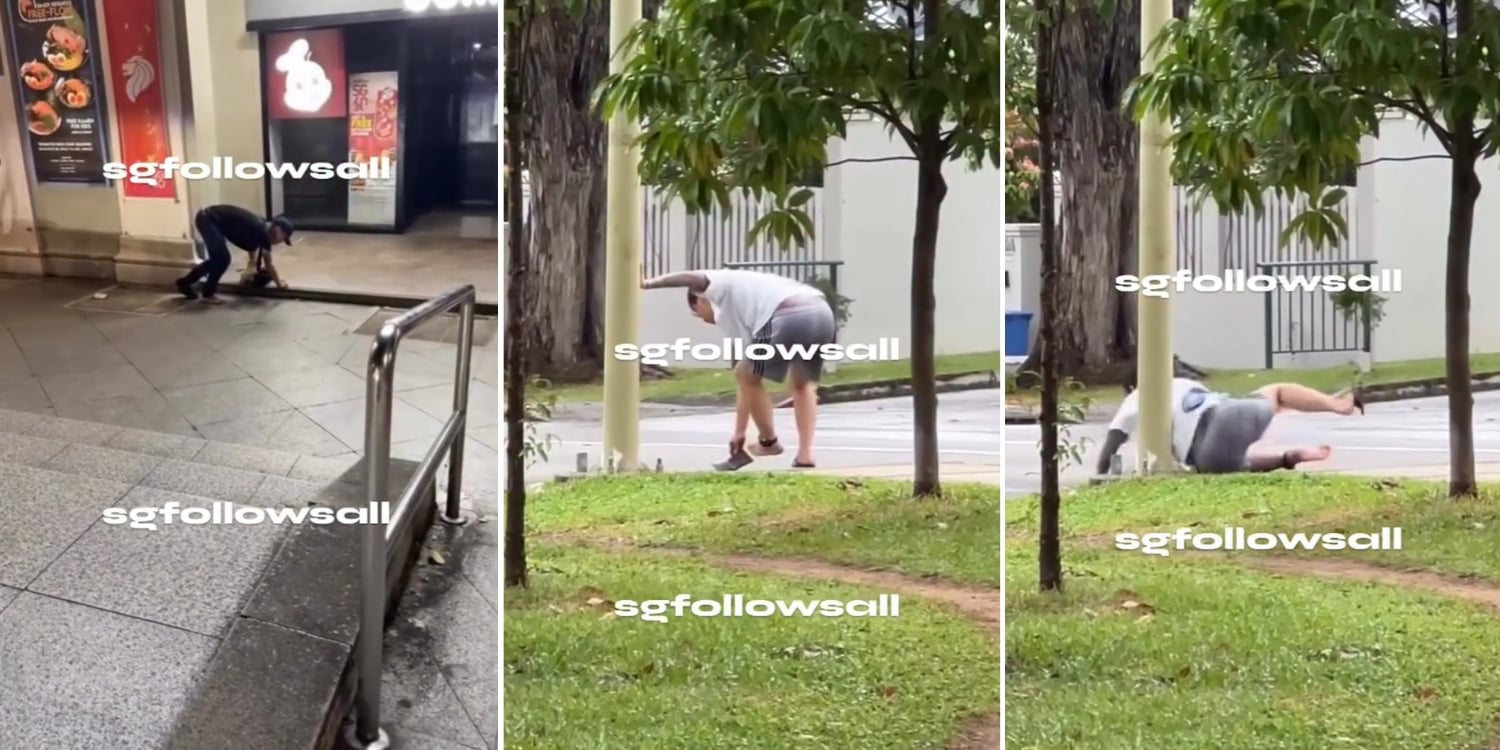The first video, uploaded by sgfollowsall, depicted a man in all black and wearing a cap, crawling on all fours outside a Bugis restaurant at night.