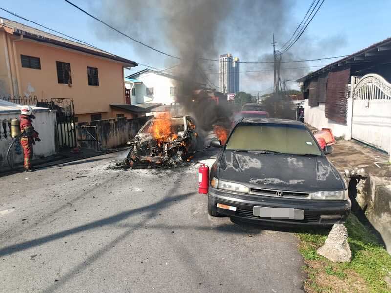 The Mercedes-Benz was completely destroyed by the fire, while a Perodua Myvi sustained about 20% damage.