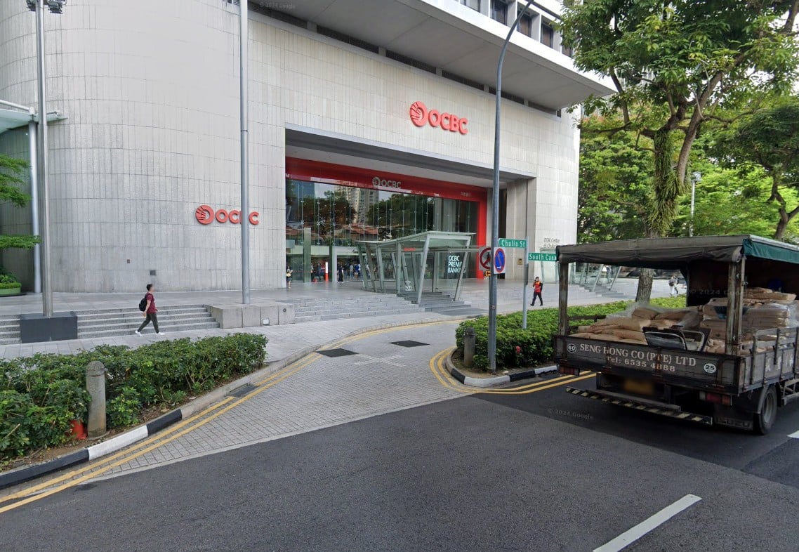 Instead of continuing along the road, the driver appears to mistake the pedestrian footpath in front of the OCBC Centre as a drivable lane.