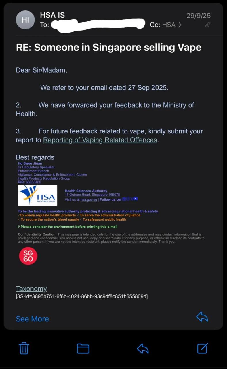 Readers also reported that an email was sent to HSA on 27 Sept regarding the alleged sale and import of vaporisers.