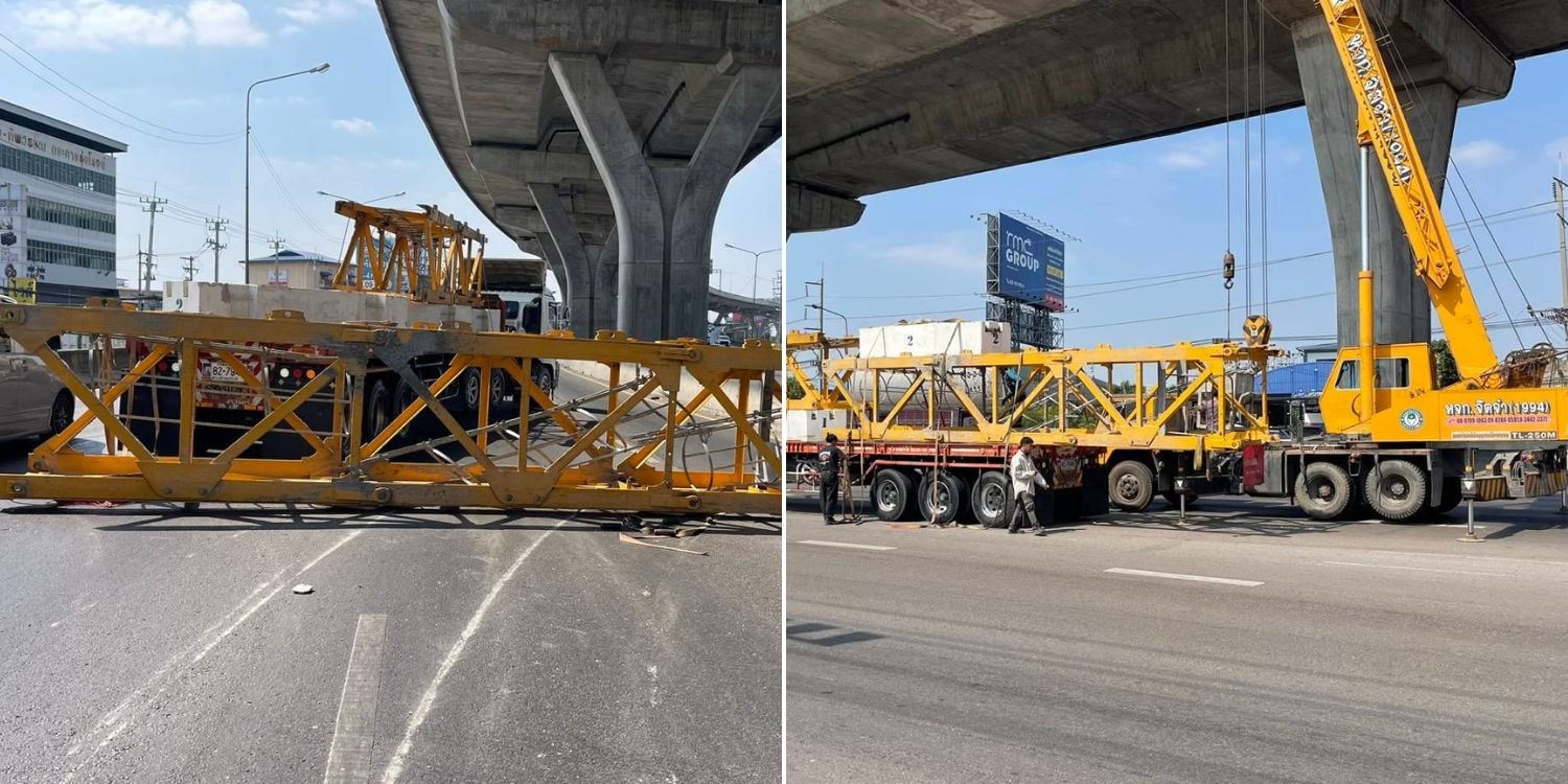 Upon questioning, the truck driver said he was on his way back from a construction site in Bangkok. He was en route to his company in Samut Sakhon when the accident occurred. During his journey, the fastener came loose, causing the frame to slide off.