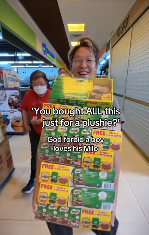 In another TikTok video, user @theongreyboi showed himself carrying a stack of Milo cartons piled up to his chin as he walked out of Sheng Siong Supermarket on Sunday (27 April).