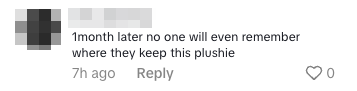 “1 month later, no one will even remember where they kept this plushie,” another commented.