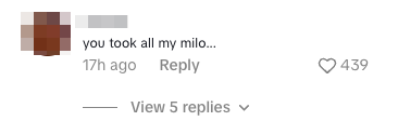 Meanwhile, reacting to the video of the TikToker hauling away a mountain of Milo cartons, a cheeky commenter joked: “You took all my Milo.”