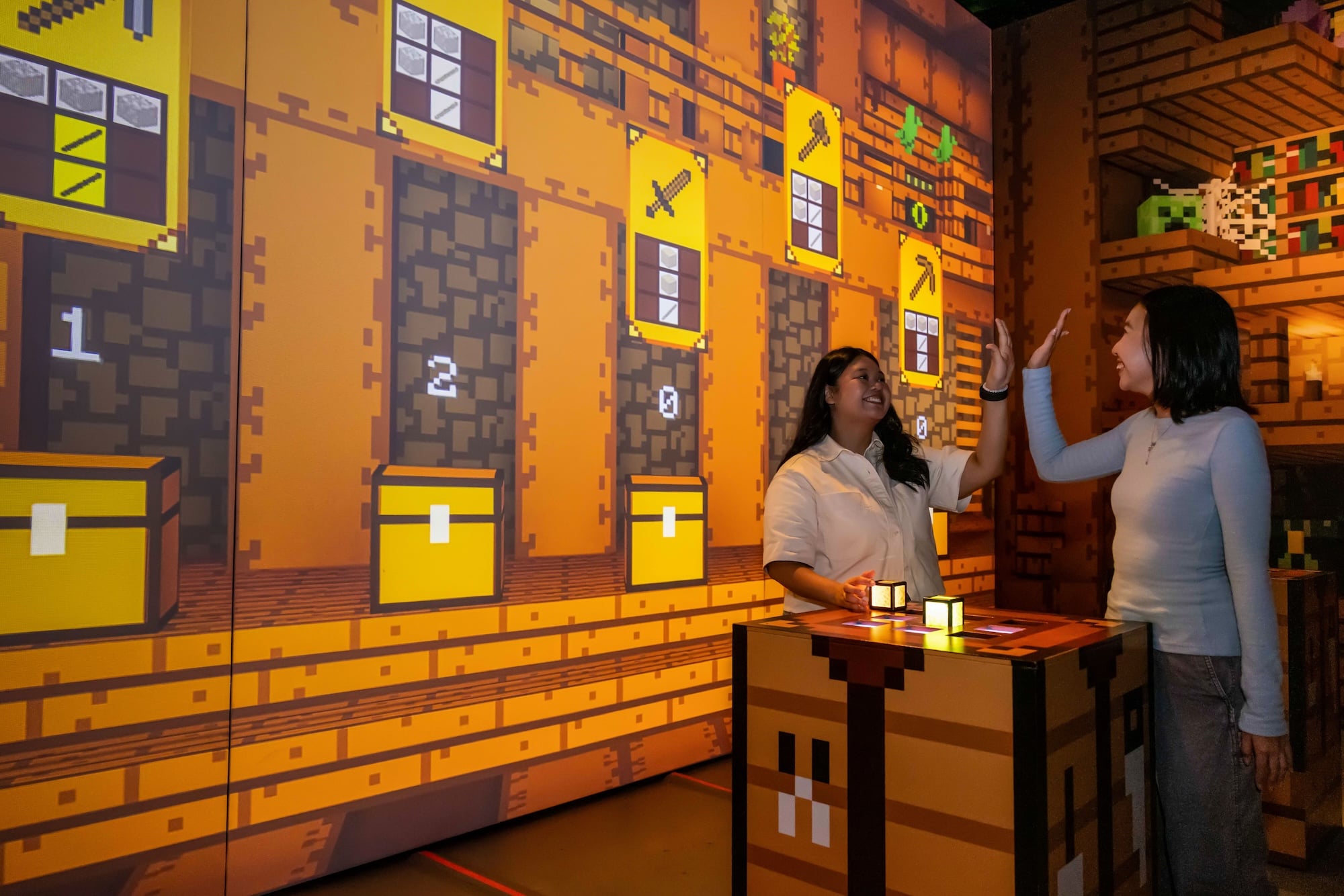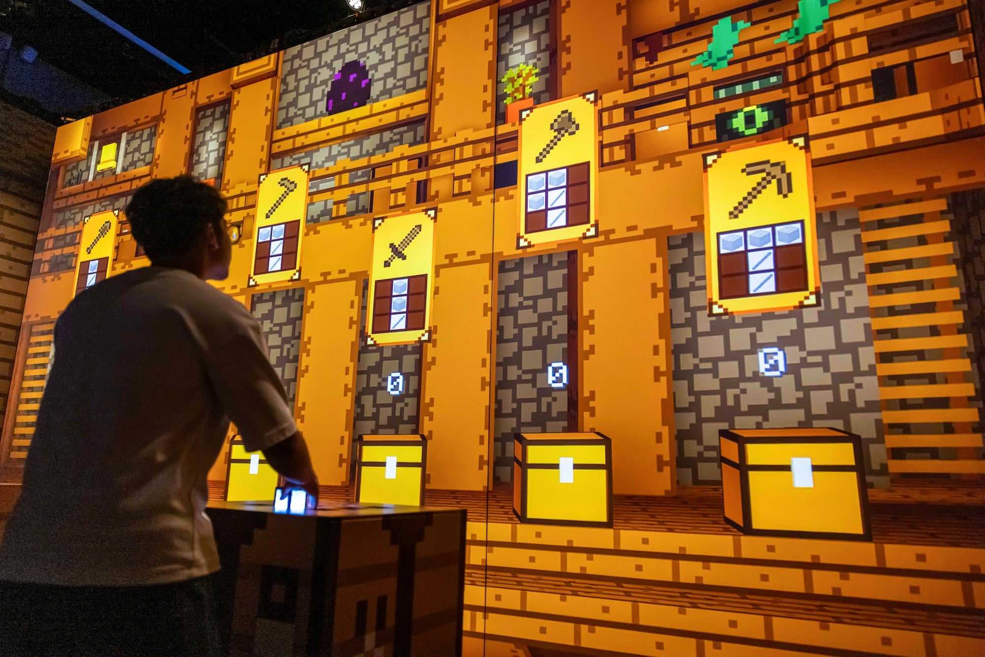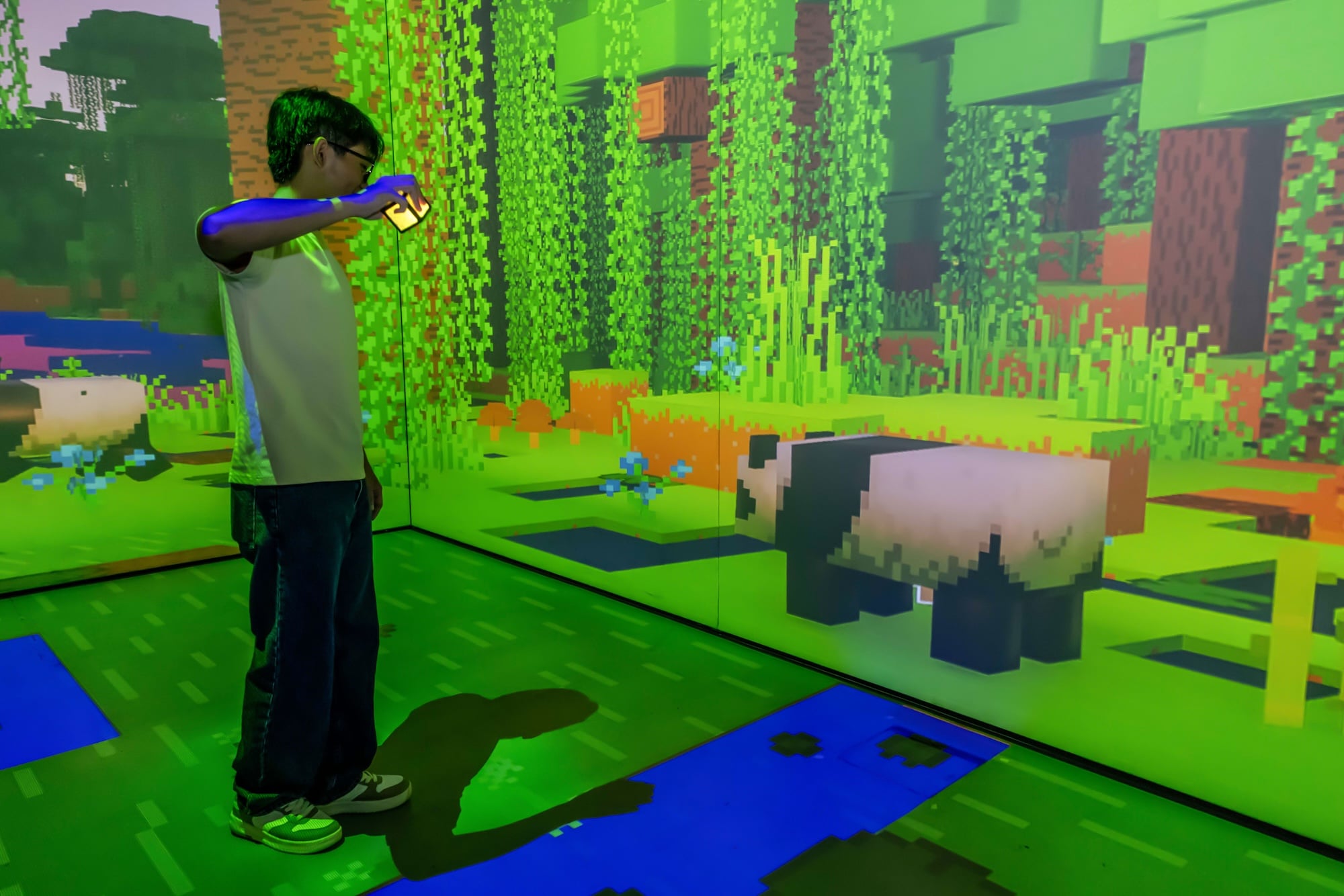 Each space blends large-scale projections, physical sets, and motion-tracking gameplay, creating an environment where the digital world of Minecraft is translated into a physical, walk-through experience.