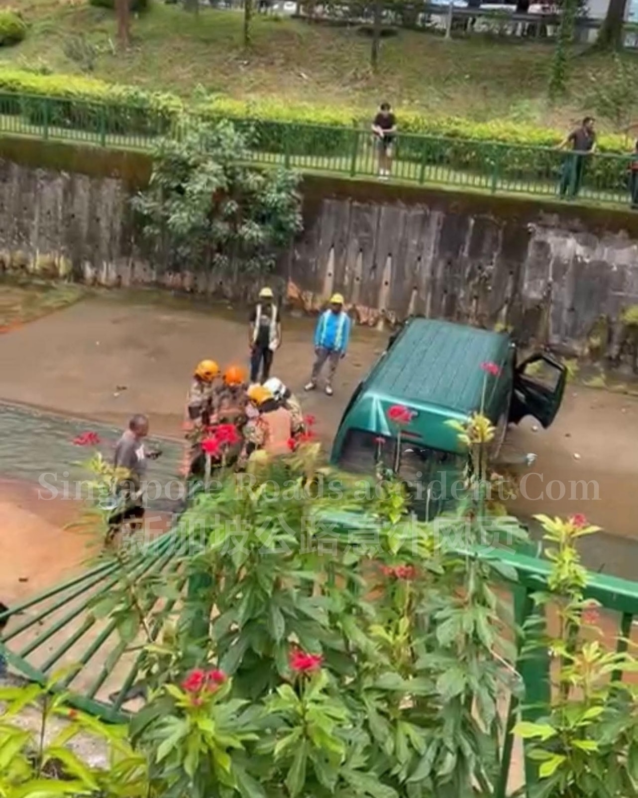 Photos of the incident posted by Singapore roads accident.com on Facebook showed the green vehicle had landed upright with its rear partially inside the ditch.