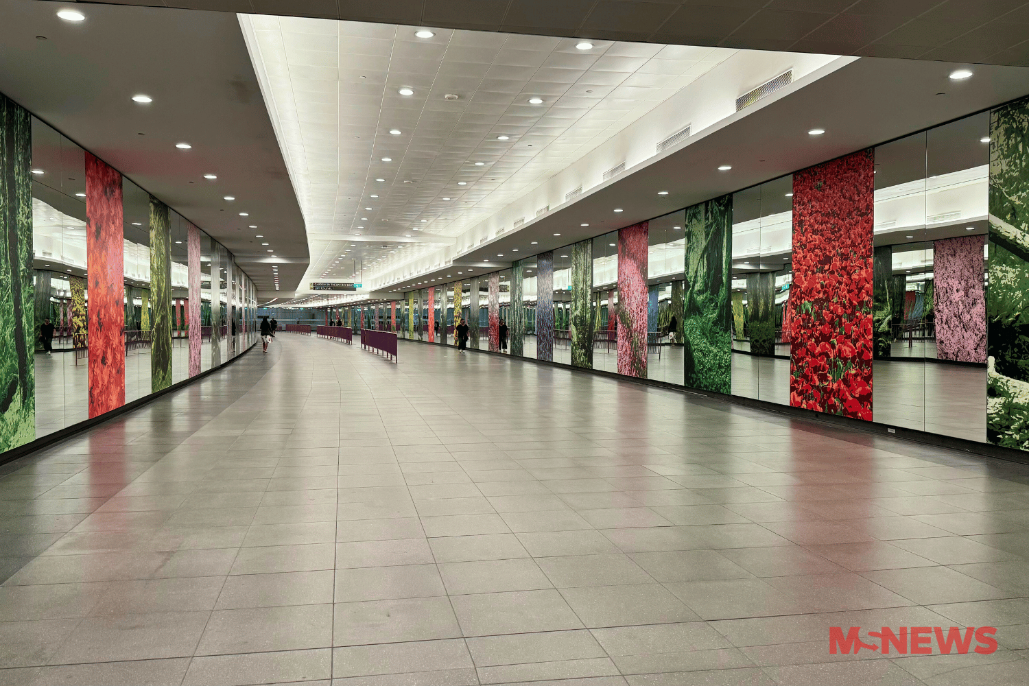 Further along the underpass, several mirror panels remain uncovered, with floral posters installed between panels.