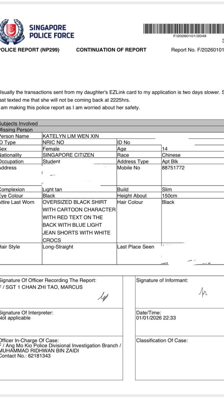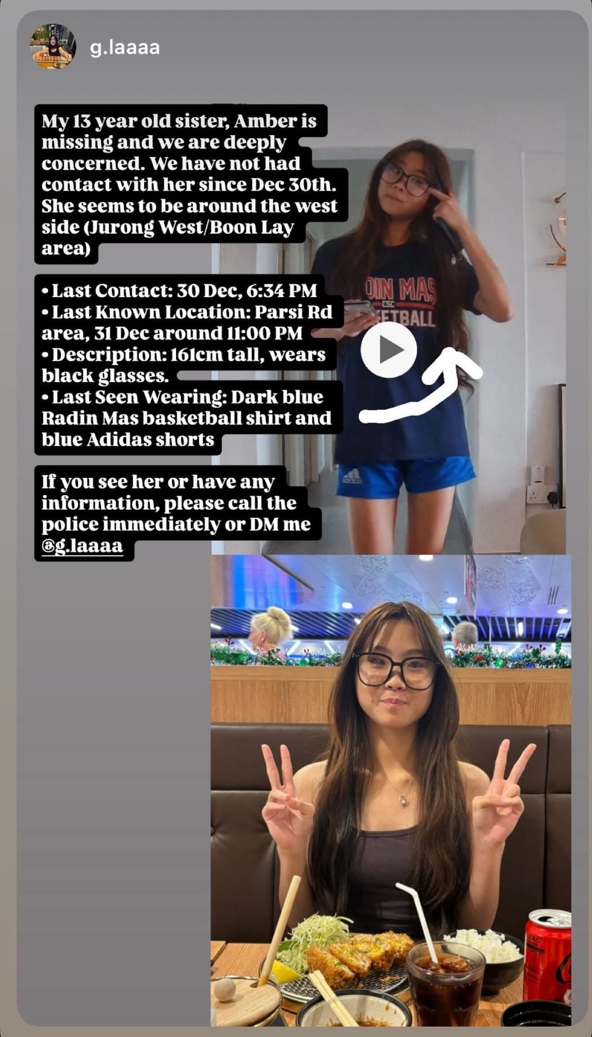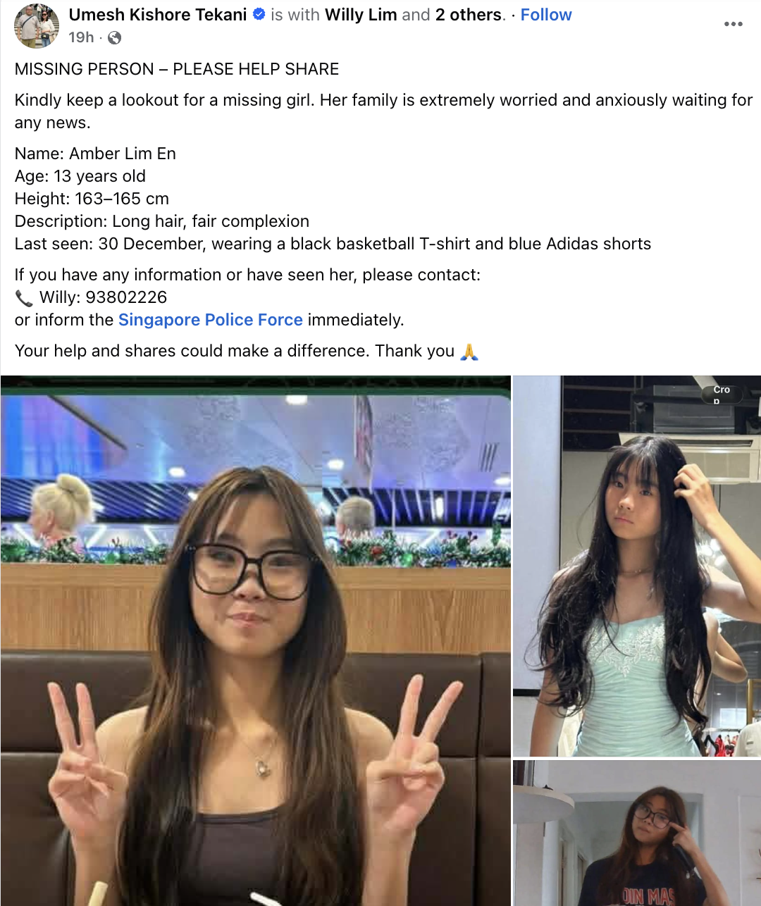 A family is urgently appealing for public assistance after 13-year-old Amber Lim En was reported missing, with no contact since 30 Dec 2025.